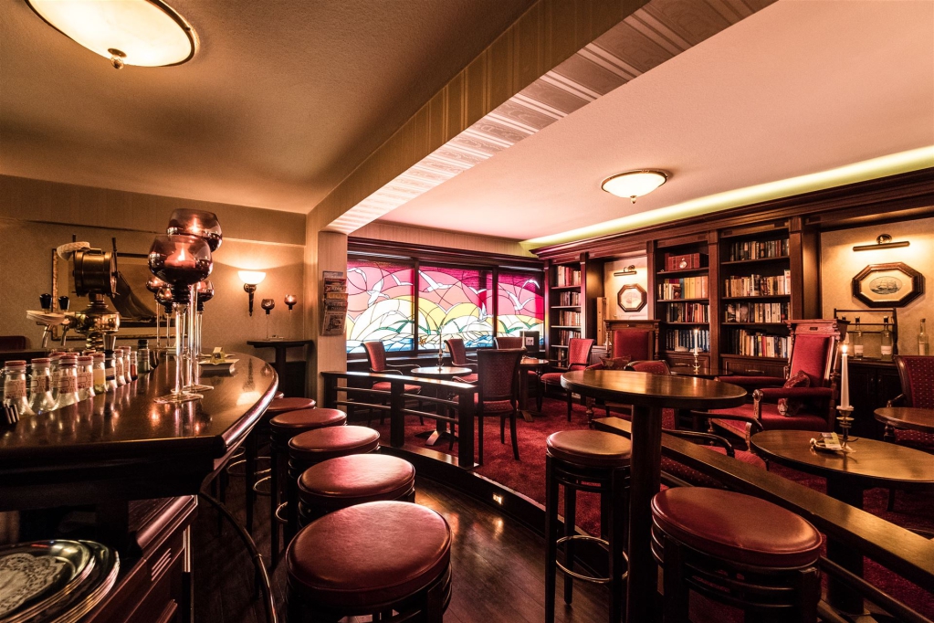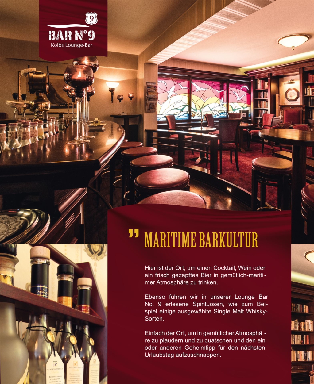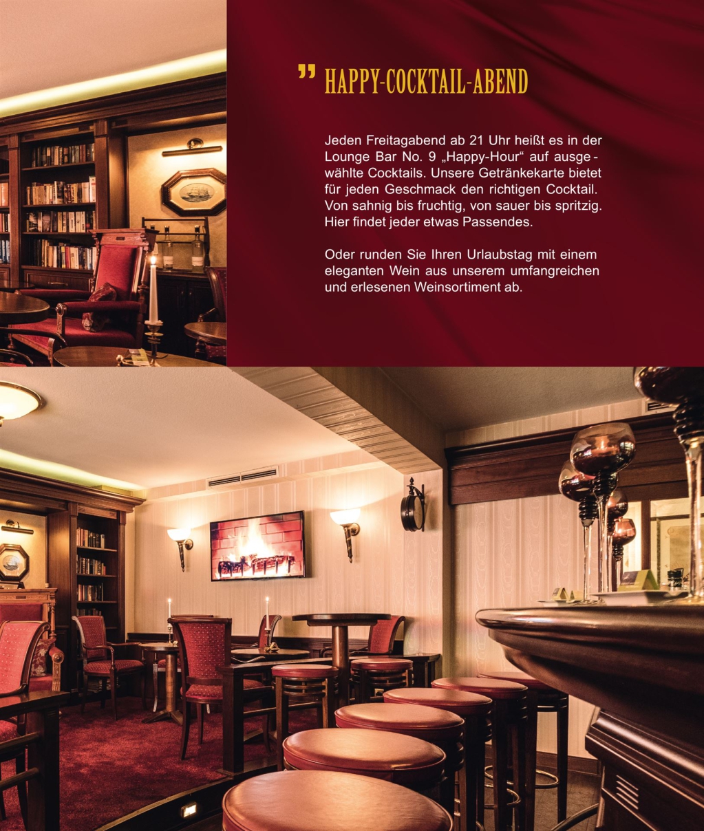 "Abends geht es in die hauseigene Lounge BAR N° 9. In angenehmer Gesellschaft, bei lässiger Barmusik und prickelndem Champagner lassen wir den verbrachten Tag Revue passieren."